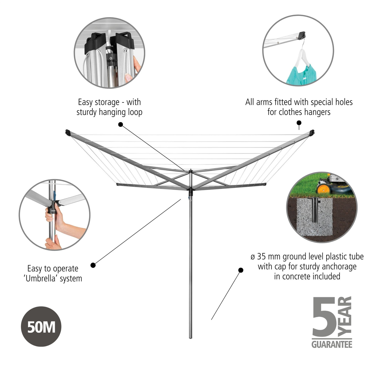 - Can hold up to four machine loads of laundry - 4 arms, 50 m/164 ft of superb drying line.