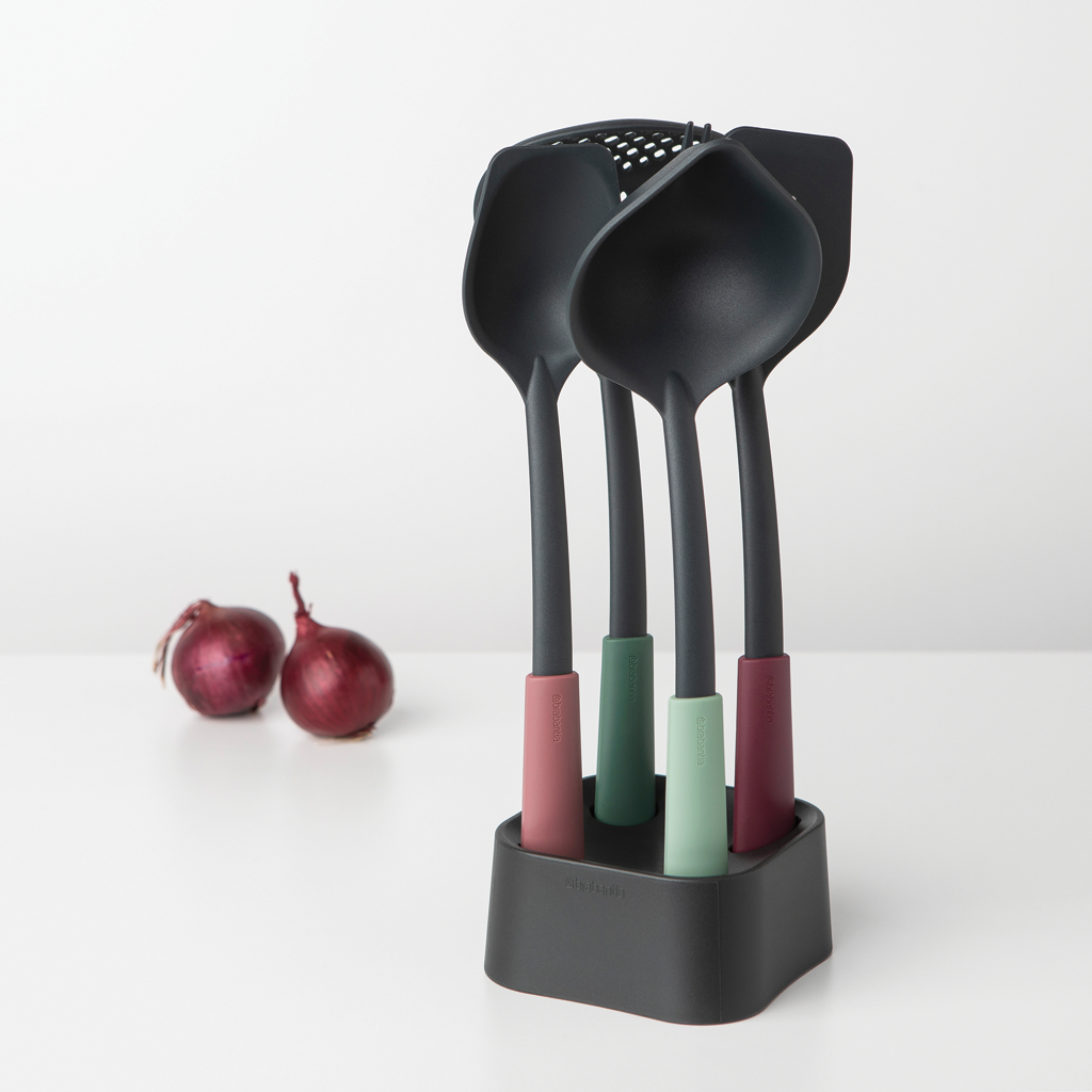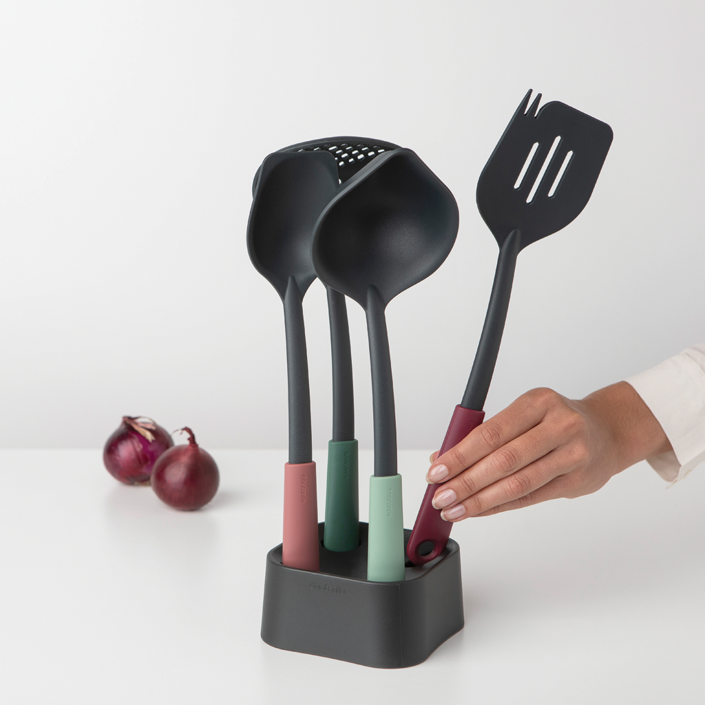 Keep your favourite kitchen helpers handy with this Tasty+ Kitchen Utensils Set plus Stand. A smart set of a stand and 4 two-in-one kitchen essentials: a Soup Ladle plus Scraper Tool, a Serving Spoon plus Spatula, a Skimmer plus Ladle, and a Spatula. A winning team.